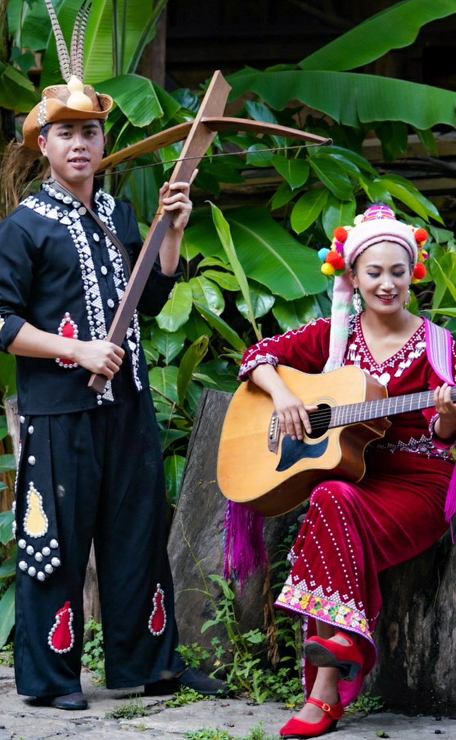 德昂族人口約1.7萬,主要分布在德宏州和保山市的潞西、梁河、瑞麗、隴川、隆陽等縣區(qū)。民居多為草排覆頂竹木結(jié)構(gòu)的干欄式建筑,眼前的德昂村建筑納入了能容納數(shù)十人居住的德昂大房子,氈帽頂?shù)男》孔樱€有頗具浪漫色彩的大公房、小公房……還建有“龍陽塔”標志及佛教奘房、佛塔。德昂族民間普遍信奉南傳佛教,民俗活動與佛事活動關(guān)聯(lián)緊密。潑水節(jié)、開門節(jié)、關(guān)門節(jié)是重大節(jié)日。德昂族服飾色彩豐富,口頭文學特別是民歌創(chuàng)作活動...